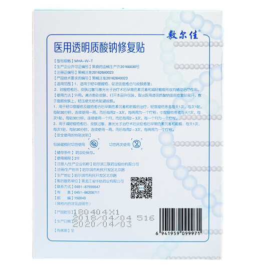 • 产品名称:敷尔佳 医用透明质酸钠修复贴面膜 面部敷料修复膜白膜 医美术后修复补水白膜一盒 院线版(5片装/盒)