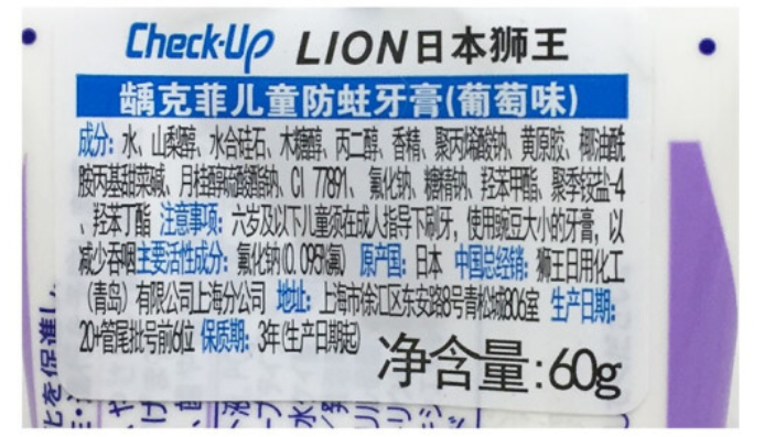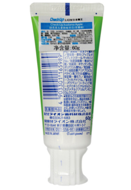 • 产品名称:LION/狮王 Check-Up龋克菲儿童防蛀牙膏(950PPm) 60g