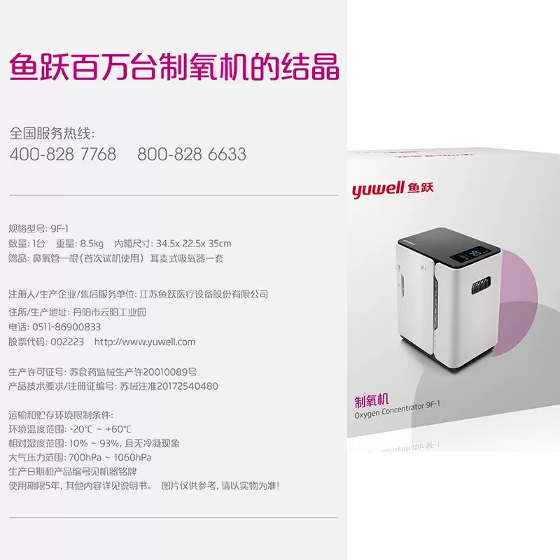 • 产品名称:鱼跃 9F-1制氧机便携式家用1升孕妇儿童老人遥控智能语音吸氧机