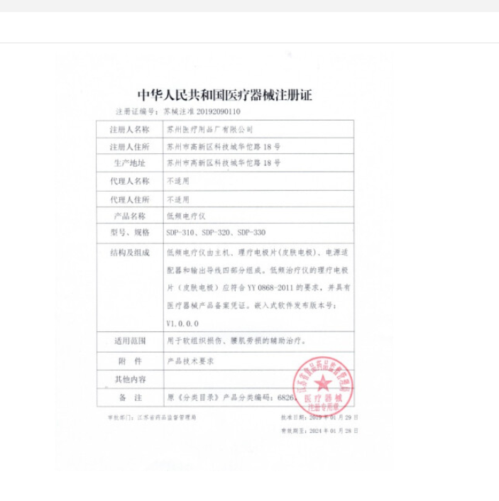 • 产品注册登记证书号:无