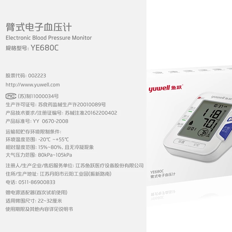 • 产品名称:鱼跃电子血压计YE680C带语音款家用上臂式仪自动智能血压测量WAT(礼盒款)